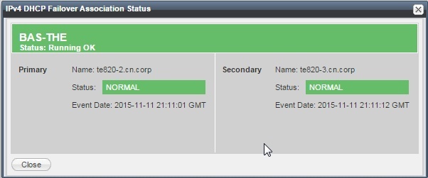 The failover association status can be monitored in the Infoblox GUI, either on the dashboard (using the ‘failover association status’ widget) or in the DHCP panel. The status panel should be green with both peers reporting the status as ‘Normal’.