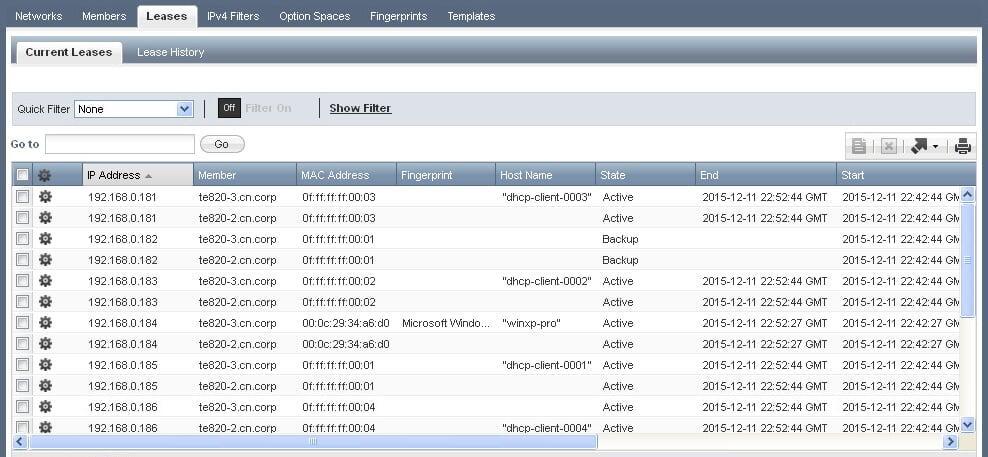 The ‘Current Leases’ view can be used to view information about current leases. When using DHCP failover, there will be two entries displayed for each IP address as both peers should have information about the lease.